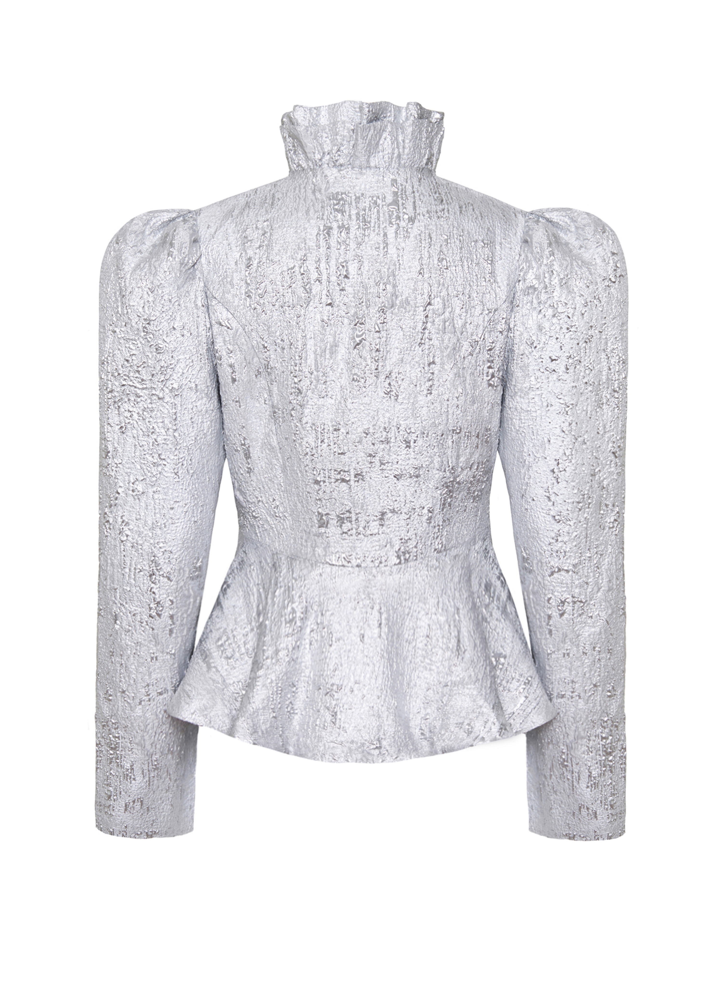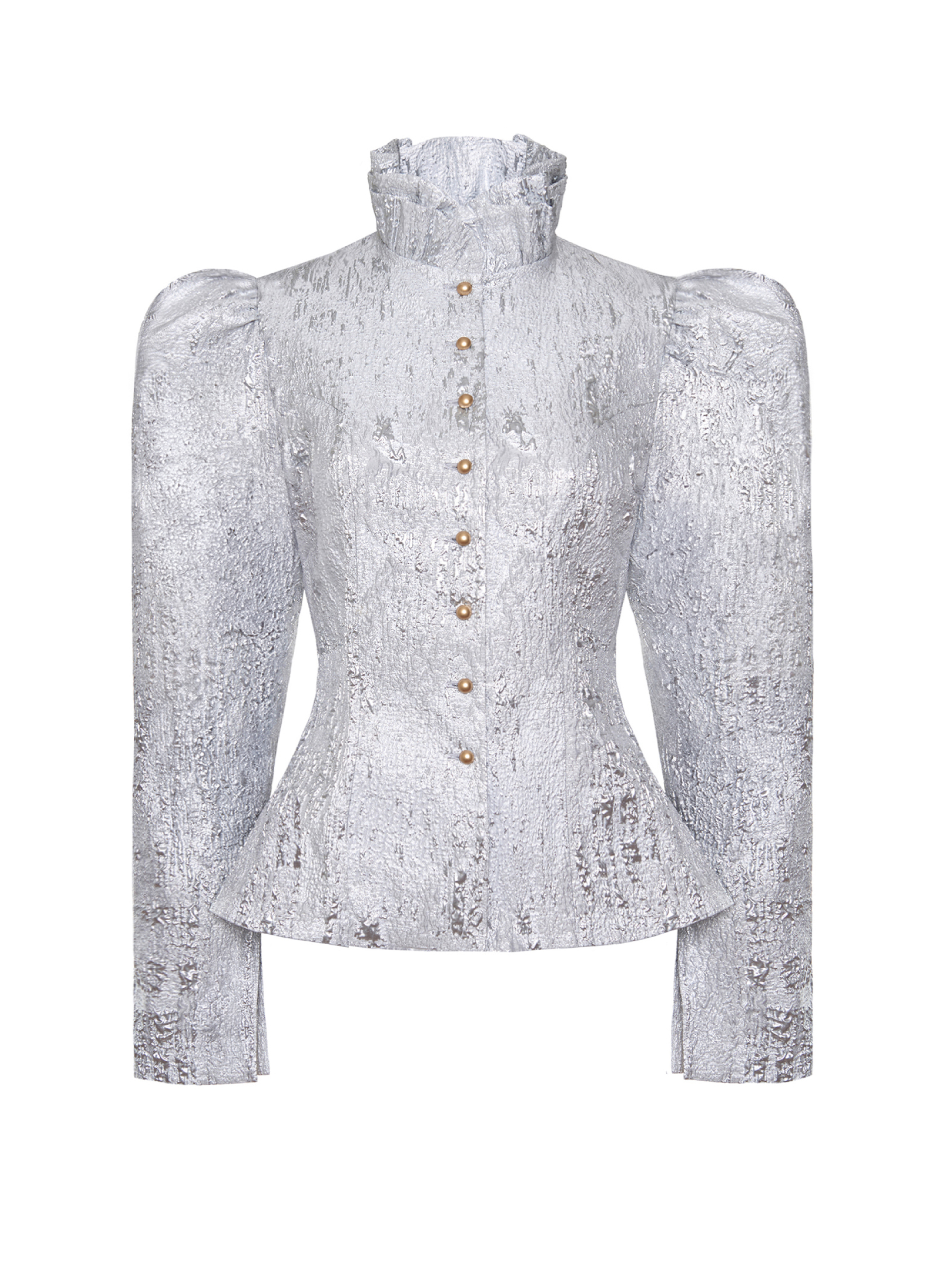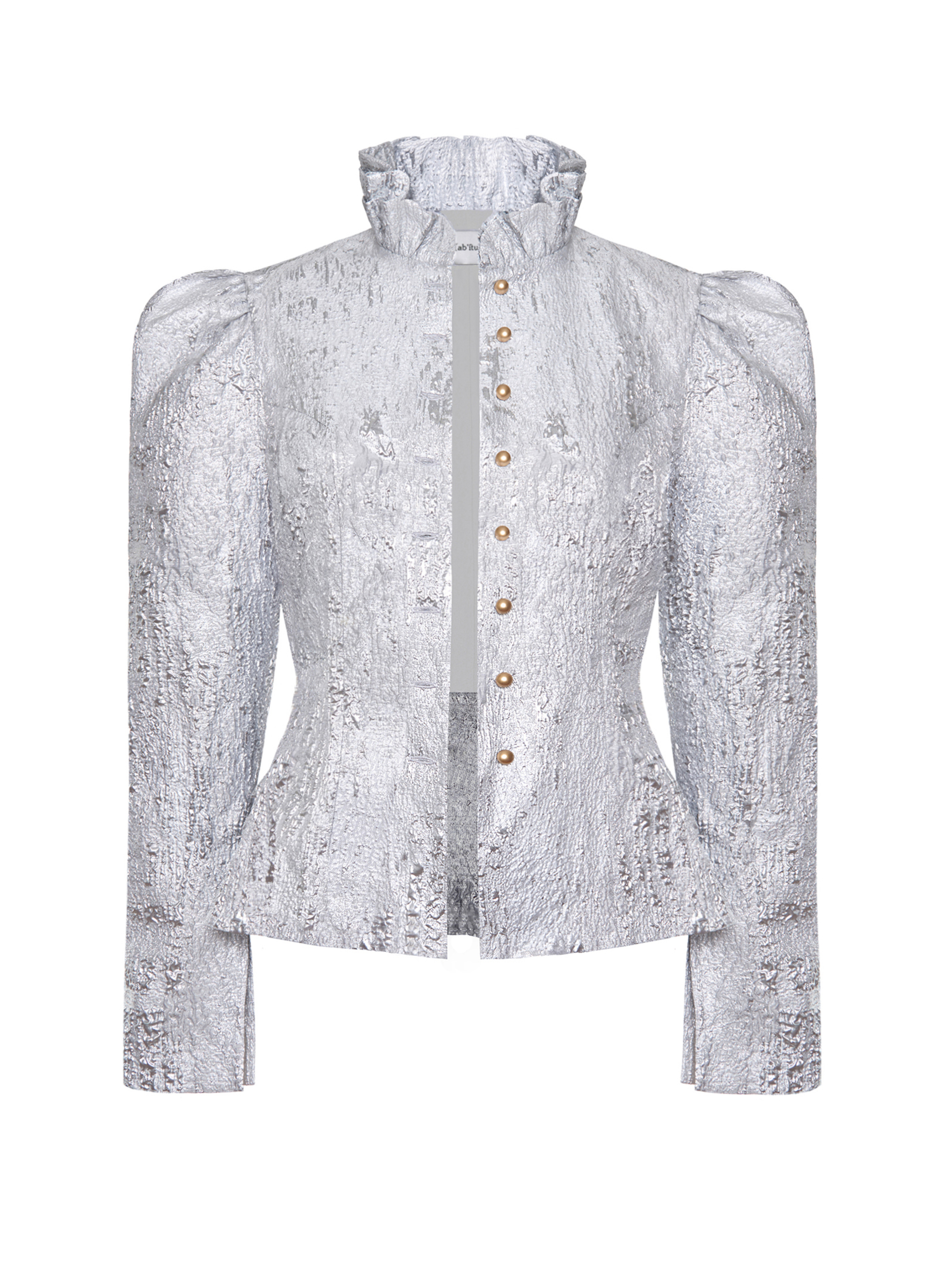 Приталенный жакет с высоким воротником и баской, на пуговицах