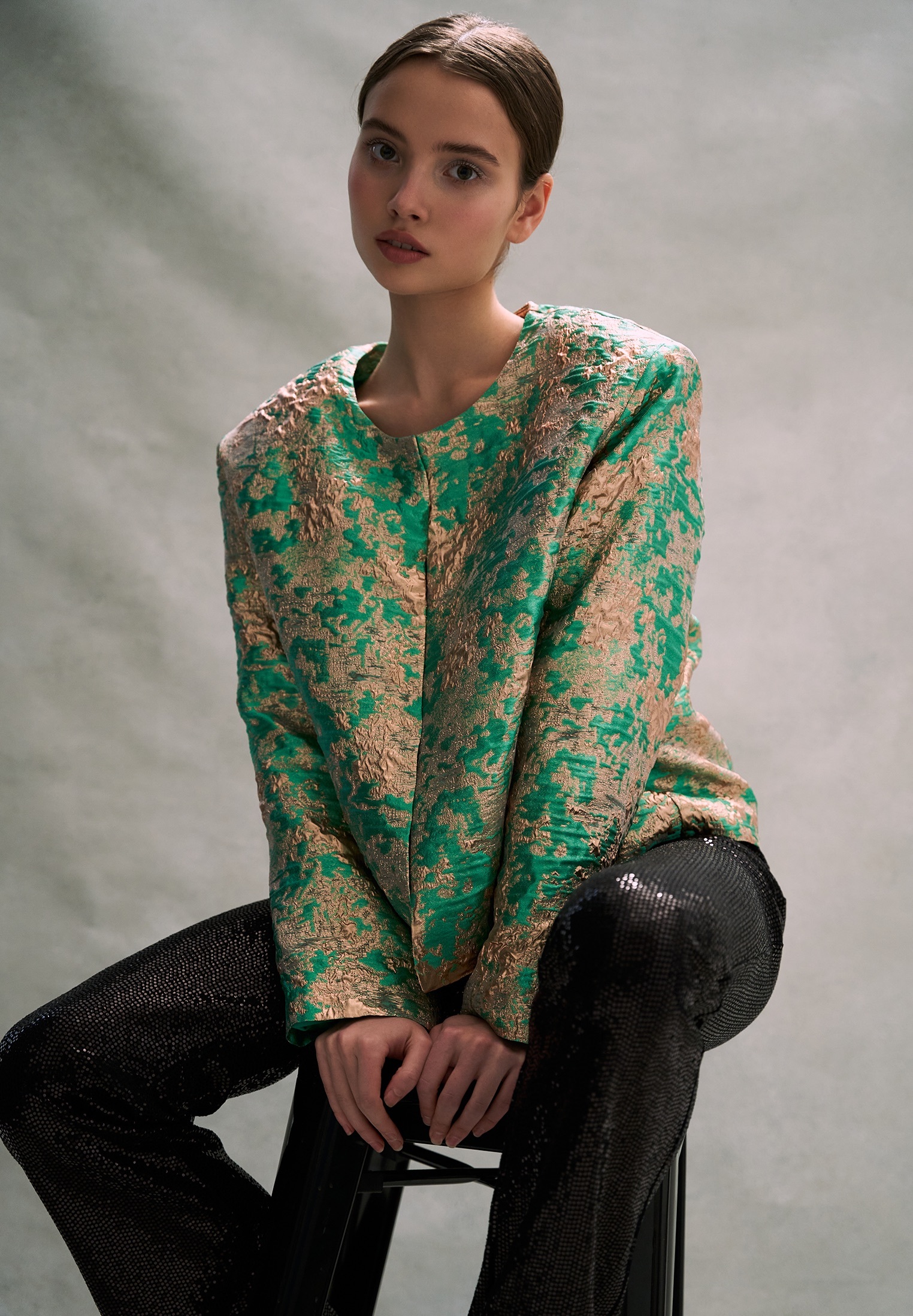 СОСТАВ: жаккард, 75% полиэстер, 25% шёлк, подкладка — 100% вискоза