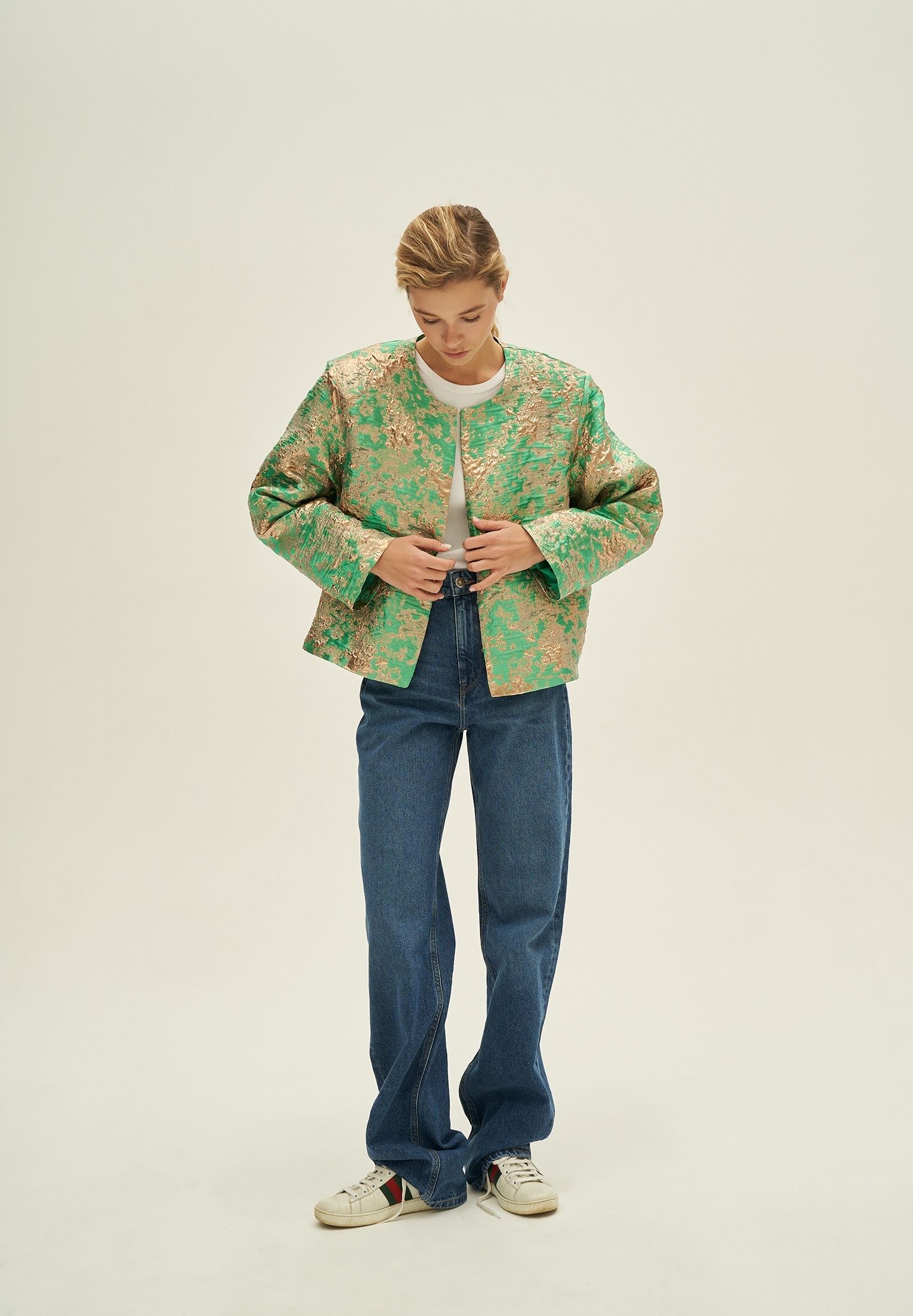 Жакет оверсайз с круглым вырезом и подплечниками, застёгивается спереди на крючки