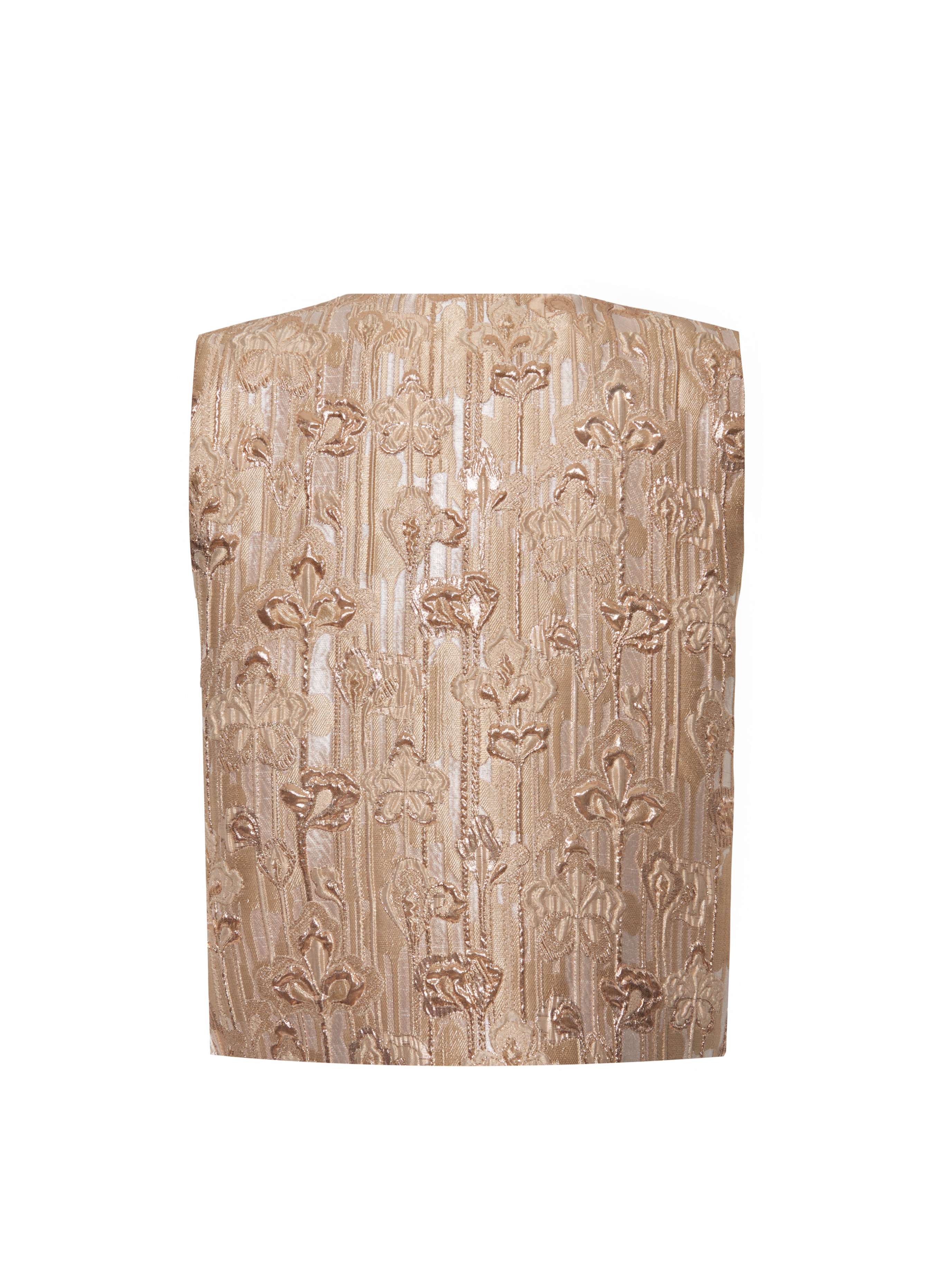 COLOUR: goldCOMPOSITION: jacquard, 75% polyester, 25% silk, lining — 100% viscose CARE: dry cleanVest with a V-neck, hook fastening