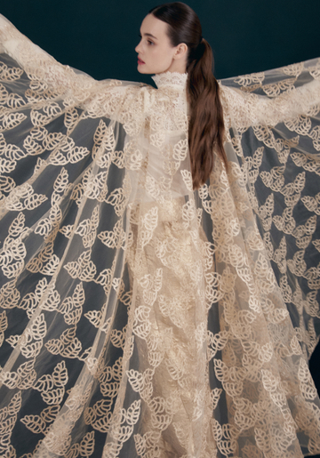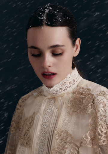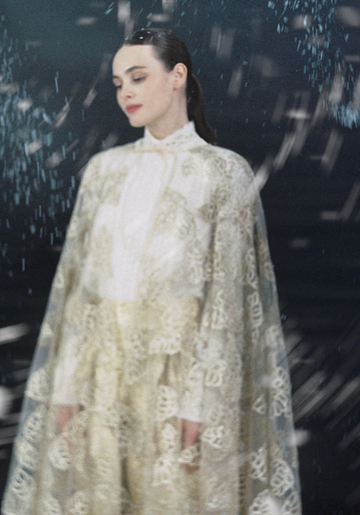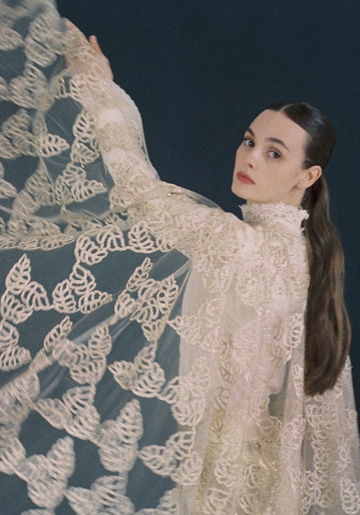 Коллекция включает драматичное длинное платье из черного жаккарда с объемным узором Phantom black, в котором Ангелина напоминает героиню полотен Михаила Врубеля — загадочную и притягательную.