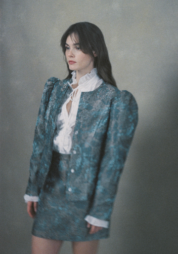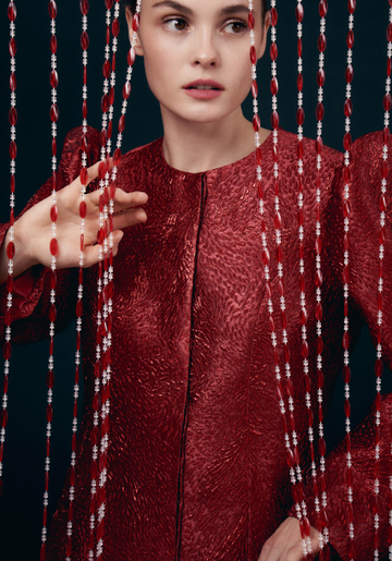Костюмы глубоких темно-красного и сине-зеленого оттенков вдохновлены оперением мифических птиц Феникс и Сирин — символов возрождения, обновления, радости и славы. Переливчатая фактура ткани напоминает волшебные перышки птиц.