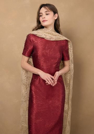 В оттенке Phoenix также представлено миди-платье-футляр — строгое и выразительное благодаря насыщенному цвету. Вместе с длинным золотистым шарфом получился образ в индийском стиле.