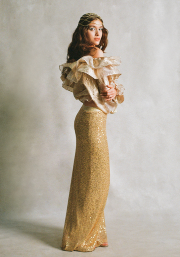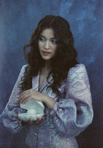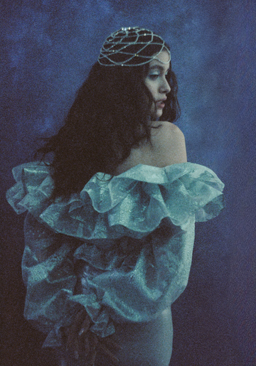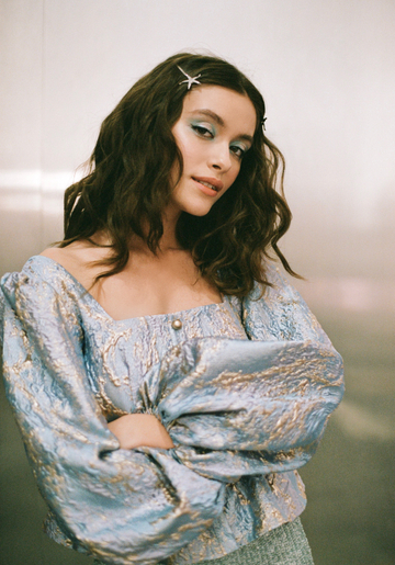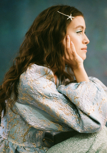 В качестве референсов для праздничной съемки мы взяли образы русалок из сказок — укладку, будто бы созданную ветрами и соленой водой, дополнили макияжем с акцентом на глаза — мерцающие голубые тени делают колдовской взгляд Саши еще выразительнее.