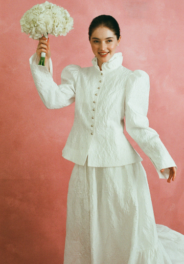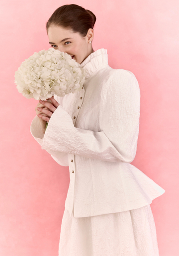 Среди новинок — платье Coco white в коротком варианте с пышной юбкой. Коллекция также представляет два новых белых костюма: комплект White dove из перламутрового атласного жаккарда с декором в виде "перышек" и комплект White onyx с жакетом с высоким воротником и миди-юбкой.