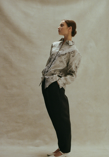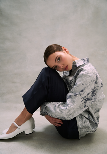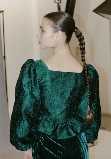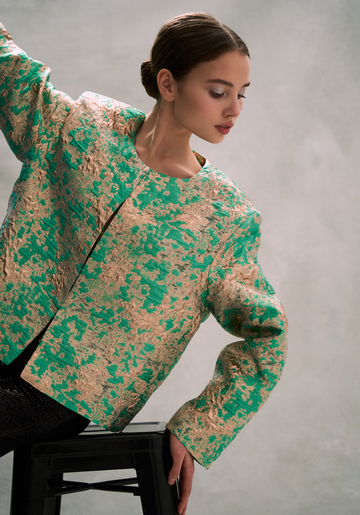 Среди новых вещей — предметы насыщенных зимних оттенков: топ глубокого зелёного цвета Emerald green, серебристо-серая рубашка из жаккарда Silver rain и прямой жакет в восточном стиле — Oriental green.