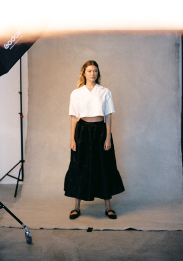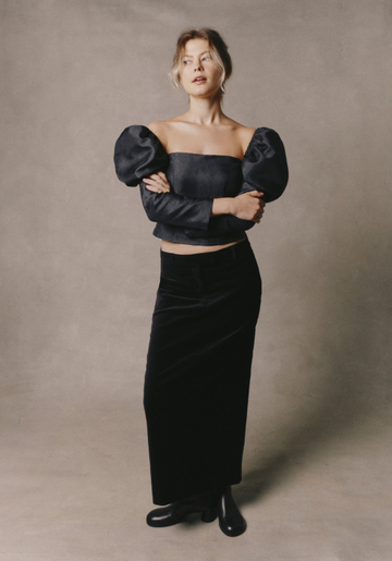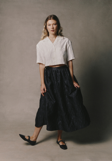 Новая модель Abitu — нарядная пышная юбка-миди Noir, украшенная сзади оборкой.