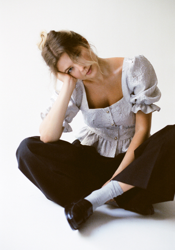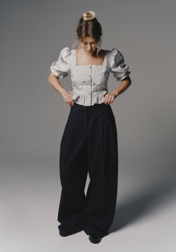 Классические модели Abitu в новых оттенках: серебристый топ на пуговицах с рукавами-фонариками Silver frost и черный топ с едва заметным цветочным узором и буфами Black sakura.
