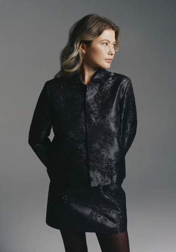 Костюм с мини-юбкой Black blossom — искрящийся черный, с фактурным цветочным рисунком.